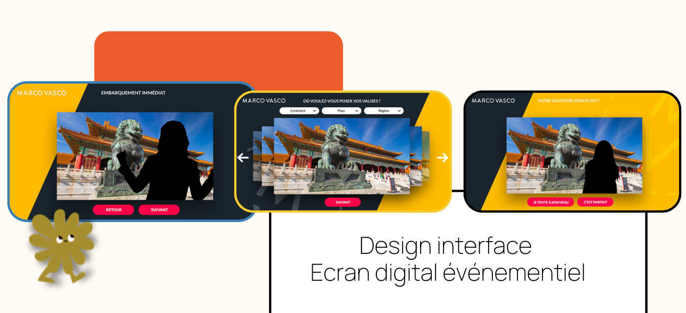 Pour Marco Vasco, agence de voyages sur mesure, j’ai conçu une interface interactive sur iPad lors d’une soirée événementielle, pensée pour créer une expérience immersive et ludique autour du voyage.